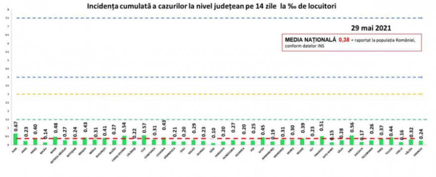 Mindegyik megyében 1 ezrelék alatti a fertőzöttségi arány. Bukarestben 0,41-ra mérséklődött az ezer lakosra jutó esetszám, egy nappal korábban 0,46 ezrelék volt. Továbbra is Fehér megyében a legnagyobb a lakosságarányos esetszám, 0,67.