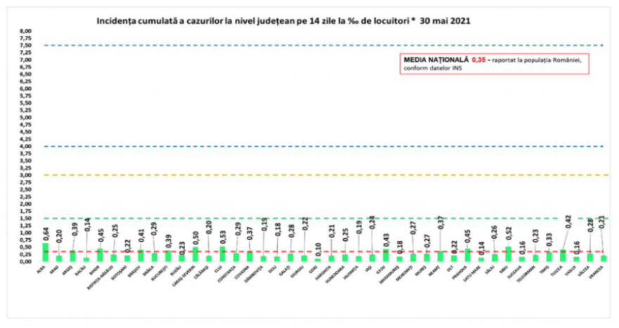 Mindegyik megyében 1 ezrelék alatti a fertőzöttségi arány. Bukarestben 0,39-re mérséklődött az ezer lakosra jutó esetszám, egy nappal korábban 0,41 ezrelék volt. Fehér megyében a legnagyobb az incidencia, 0,64. A legalacsonyabb incidenciát (0,1) Gorj megyéből jelentették.