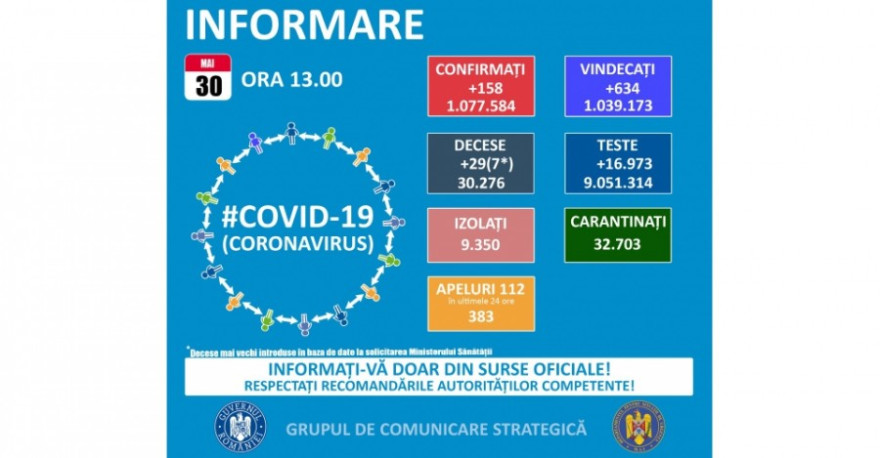 A GCS adatai szerint az elmúlt 24 órában 18 koronavírussal fertőzött férfi és 11 nő elhalálozását jelentették. Őket Fehér, Bákó, Beszterce-Naszód, Brăila, Brassó, Krassó-Szörény, Kolozs, Konstanca, Dolj, Giurgiu, Ialomiţa, Mehedinţi, Neamţ, Prahova, Szeben, Temes, Tulcea, Vâlcea megyei, valamint bukaresti kórházakban kezelték.