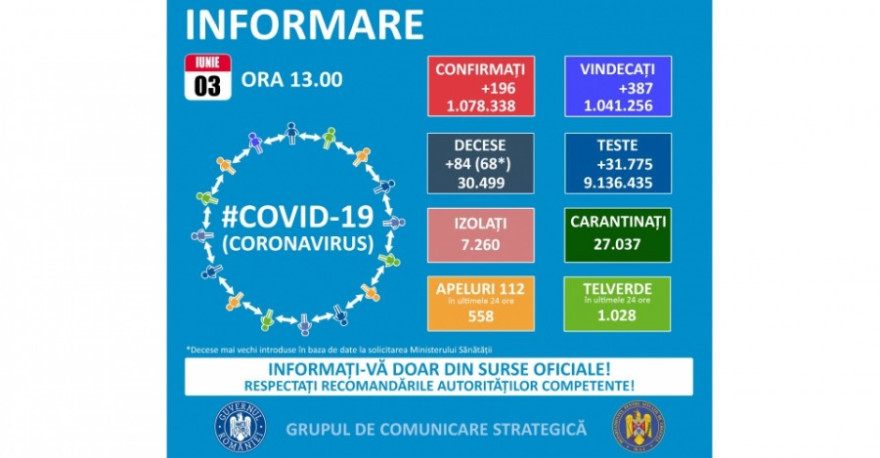 A legutóbbi tájékoztatás óta 196 új koronavírusos megbetegedést igazoltak Romániában, azt követően, hogy az elmúlt 24 órában országszerte 31.775 koronavírustesztet végeztek – közölte csütörtökön a Stratégiai Kommunikációs Csoport (GCS).