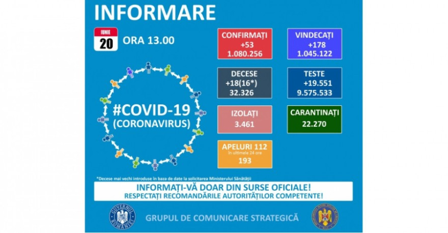 A legutóbbi tájékoztatás óta 53 koronavírusos megbetegedést igazoltak Romániában, több mint 19 ezer teszt eredményének feldolgozása nyomán – közölte vasárnap a Stratégiai Kommunikációs Csoport (GCS).