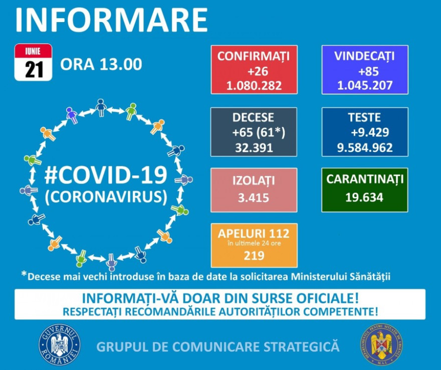 Huszonhat megyéből – Fehér, Arad, Beszterce-Naszód, Brassó, Călăraşi, Kolozs, Kovászna, Dâmboviţa, Galac, Giurgiu, Gorj, Hargita, Hunyad, Ialomiţa, Iaşi, Mehedinţi, Olt, Szatmár, Szilágy, Szeben, Suceava, Teleorman, Tulcea, Vaslui, Vrancea – egyetlen új esetet sem jelentettek.