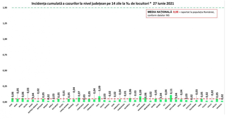 Minden megye zöld zónás, lakosságarányosan Prahova megyében a legmagasabb a fertőzöttségi ráta, 0,11, míg Ilfov megyében 0,09, Kolozs megyében pedig 0,07 ezrelék.