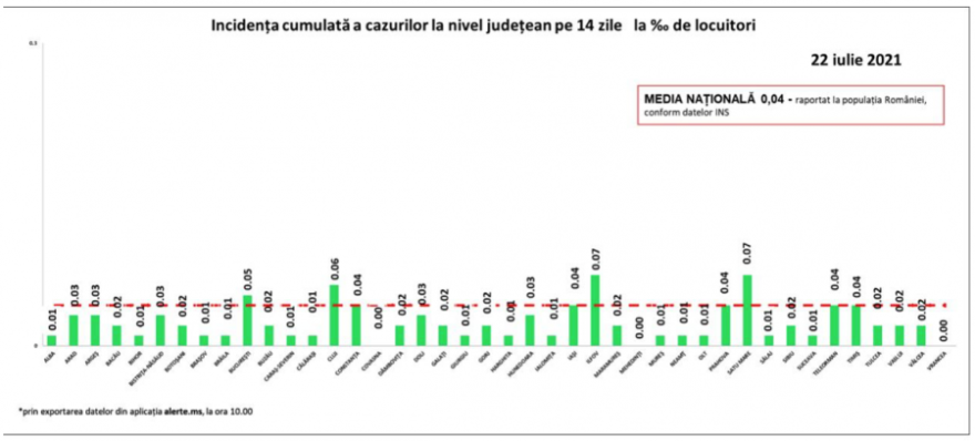 Az összes megye és a főváros is zöld zónás, lakosságarányosan Ilfov és Szatmár megyében a legmagasabb a fertőzöttségi ráta, mindkét megyében 0,07 ezrelék, majd Kolozs megye következik 0,06 ezrelékes incidenciával.