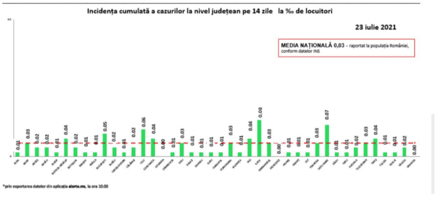 Az összes megye és a főváros is zöld zónás, lakosságarányosan Ilfov megyében a legmagasabb a fertőzöttségi ráta, 0,08 ezrelék.