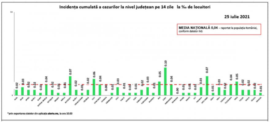 Az összes megye és a főváros is zöld zónás, lakosságarányosan Ilfov megyében a legmagasabb a fertőzöttségi ráta, 0,10 ezrelék.