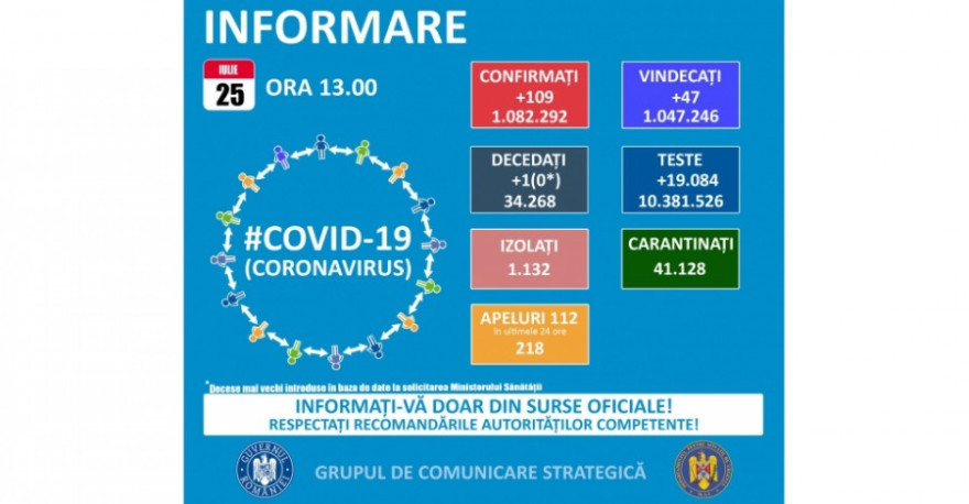 A legutóbbi tájékoztatás óta 109 új koronavírusos megbetegedést igazoltak Romániában, több mint 19.000 teszt eredményének feldolgozása nyomán – közölte vasárnap a Stratégiai Kommunikációs Csoport (GCS).