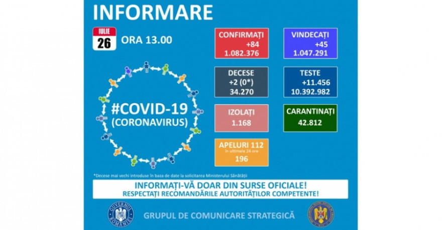 A legutóbbi tájékoztatás óta 84 új koronavírusos megbetegedést igazoltak Romániában, több mint 11.300 teszt eredményének feldolgozása nyomán – közölte hétfőn a Stratégiai Kommunikációs Csoport (GCS).