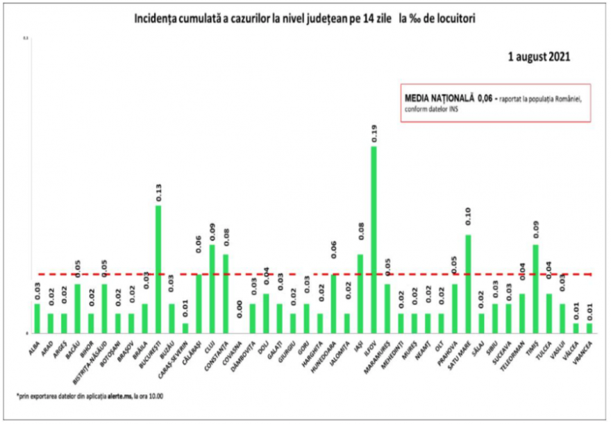 Az összes megye és a főváros is zöld zónás, lakosságarányosan Ilfov megyében a legmagasabb a fertőzöttségi ráta, 0,19 ezrelék.