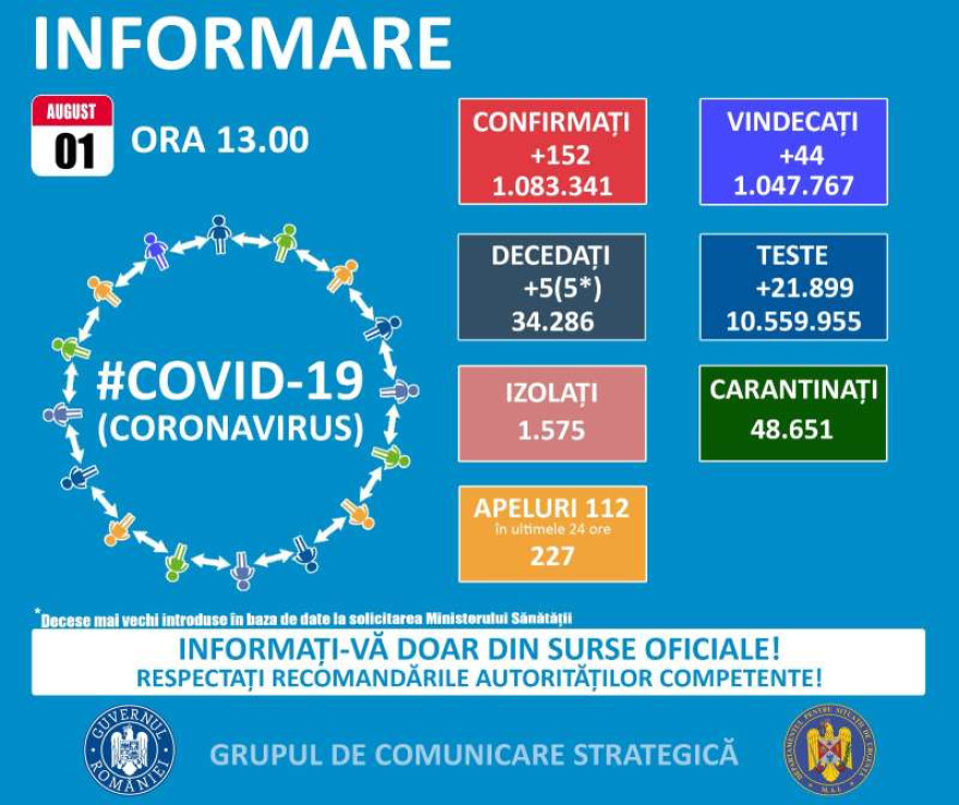 A legutóbbi tájékoztatás óta 152 új koronavírusos megbetegedést igazoltak Romániában, több mint 21.900 teszt eredményének feldolgozása nyomán – közölte vasárnap a Stratégiai Kommunikációs Csoport (GCS).