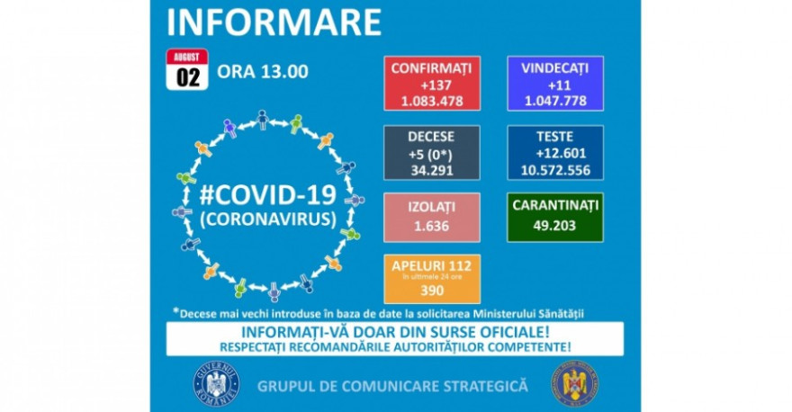 A legutóbbi tájékoztatás óta 137 új koronavírusos megbetegedést igazoltak Romániában, közel 12.500 teszt eredményének feldolgozása nyomán – közölte hétfőn a Stratégiai Kommunikációs Csoport (GCS).