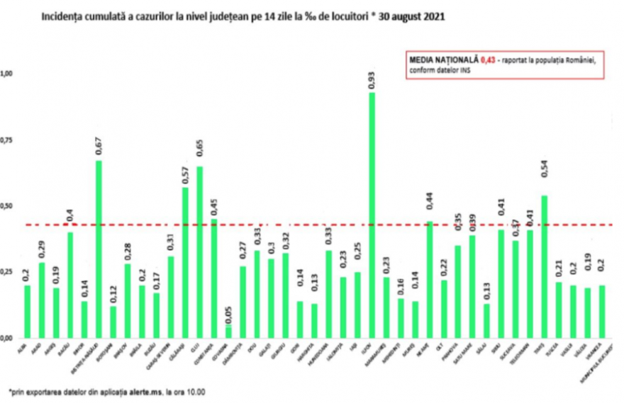 Mindegyik megye és a főváros is zöld zónás, lakosságarányosan Ilfov megyében a legmagasabb a fertőzöttségi ráta, 0,93 ezrelék.