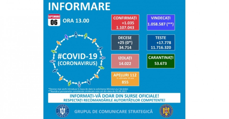 A legutóbbi tájékoztatás óta 1035 új koronavírusos megbetegedést igazoltak Romániában, 17.778 teszt eredményének feldolgozása nyomán – közölte hétfőn a Stratégiai Kommunikációs Csoport (GCS).