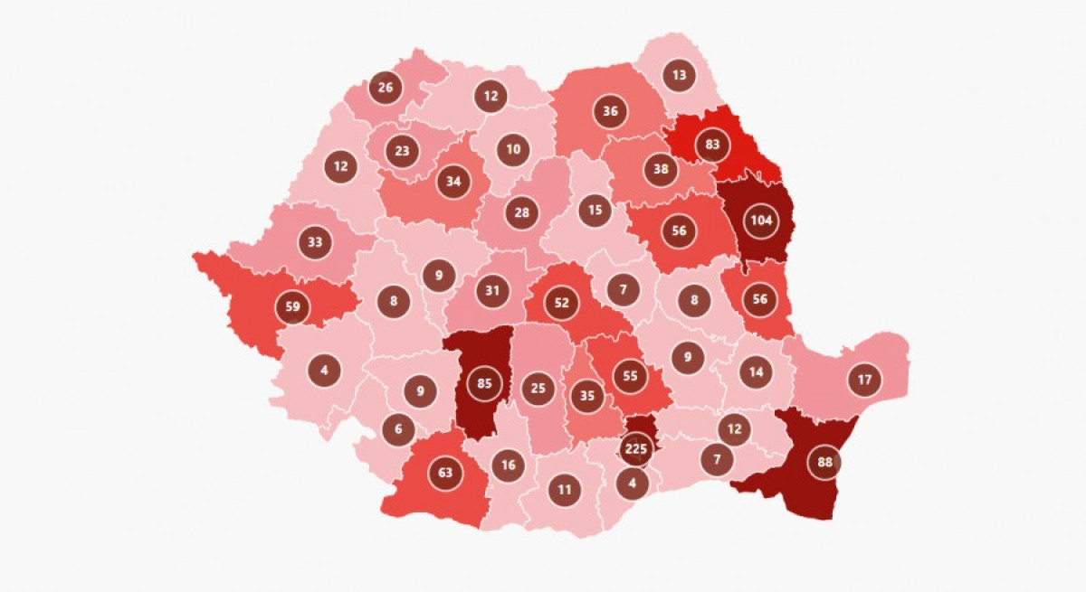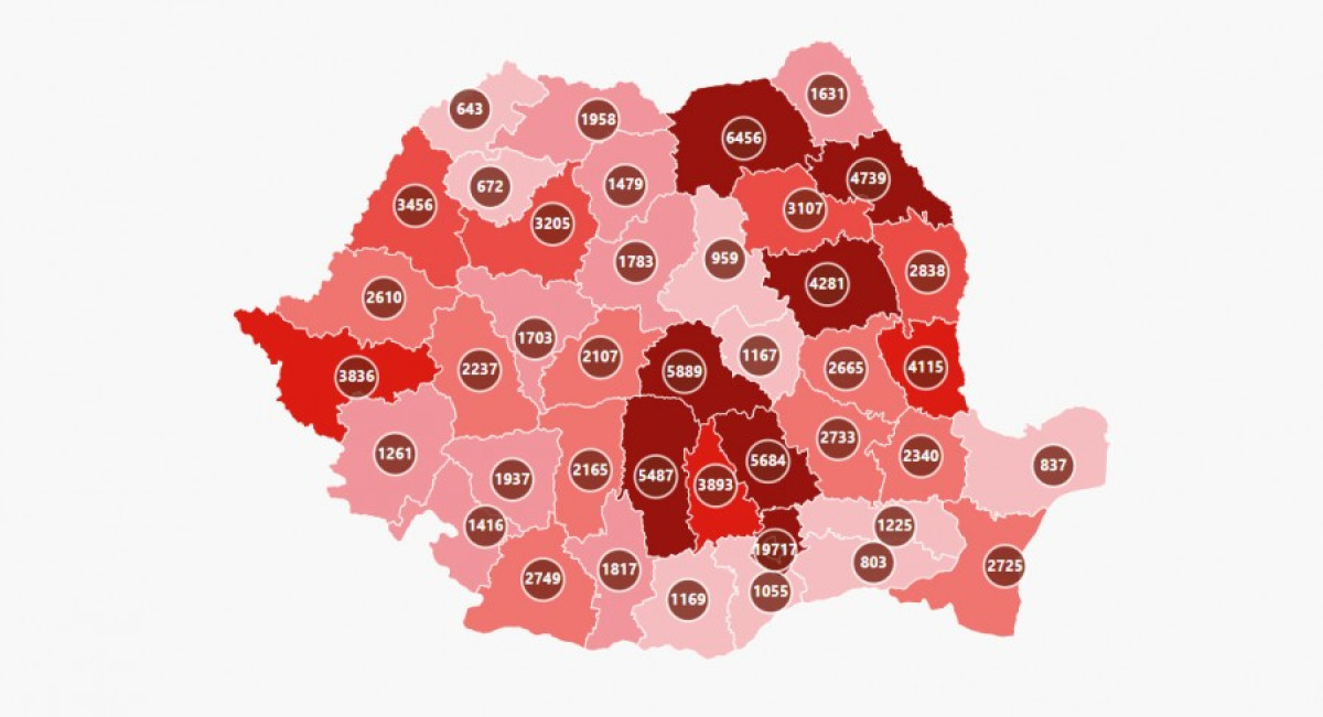 Az esetszám meghaladta a négyezret Iaşi, Bákó és Galac megyében, és túllépte a háromezres küszöböt Bihar, Kolozs, Dâmboviţa, Ilfov, Temes és Neamţ megyében.
