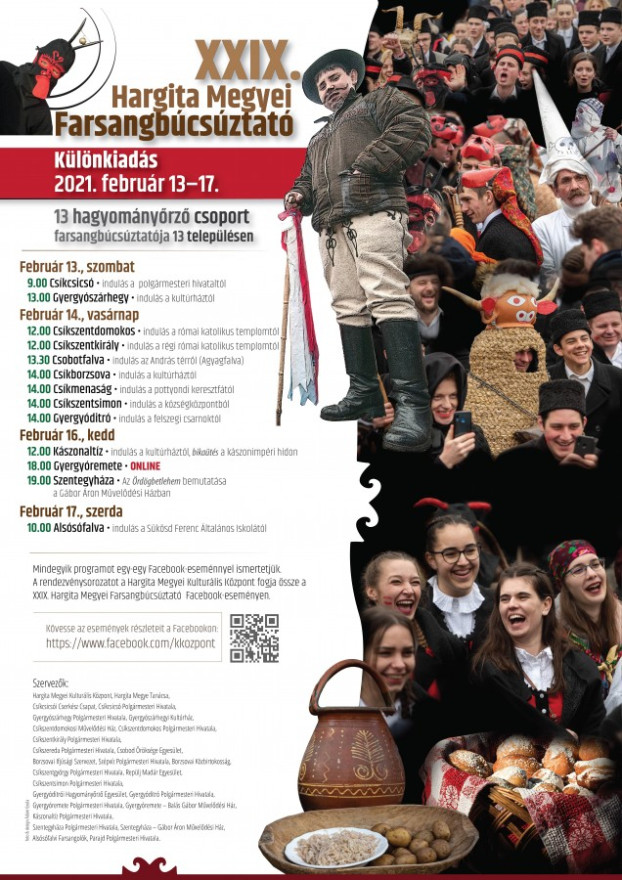 Hargita megye 13 farsangtemető hagyományőrző csoportja 13 településen búcsúztatja a farsangot 2021. február 13–17. között. Mindegyikről külön egy-egy facebook-esemény fog részletes tájékoztatást adni, az egészet pedig a Hargita Megyei Kulturális Központ fogja össze a XXIX. Hargita Megyei Farsangbúcsúztató facebook-eseményen.