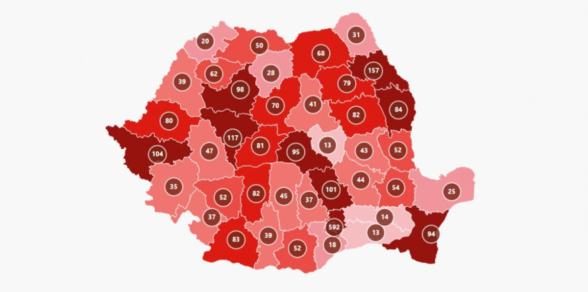 Az esetszám meghaladta a négyezret Galac, Dâmboviţa, és Temes megyében, és túllépte a háromezres küszöböt Bihar, Dolj, Kolozs, Konstanca, Ilfov, Neamţ és Vaslui megyében.