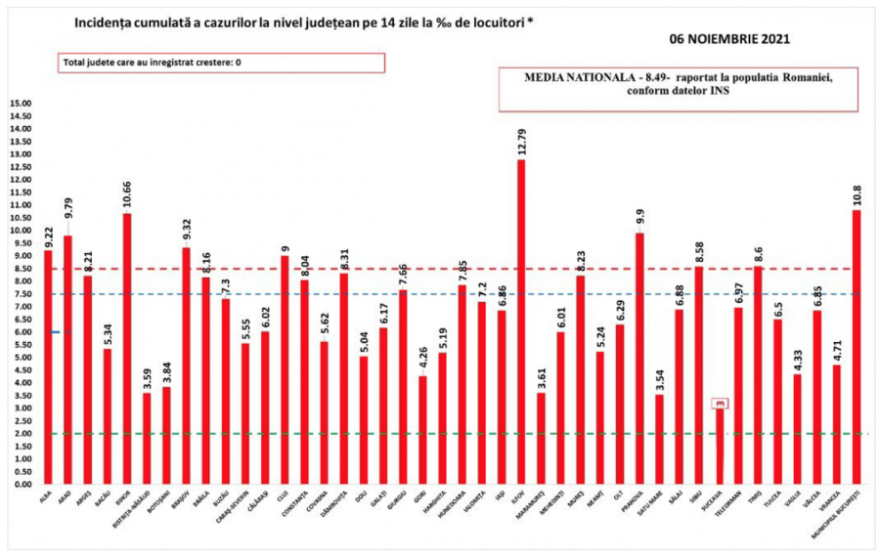 A fővárosban 10,80 ezrelékes a fertőzöttségi ráta, ez zsinórban a tizennegyedik nap, amikor enyhén csökken. A mutató továbbra is Ilfov megyében a legmagasabb, itt 12,79 az ezer lakosra jutó esetszám. Nagy a fertőzöttségi ráta Bihar (10,66), Prahova (9,9), Arad (9,79) és Fehér (9,22) megyében is.