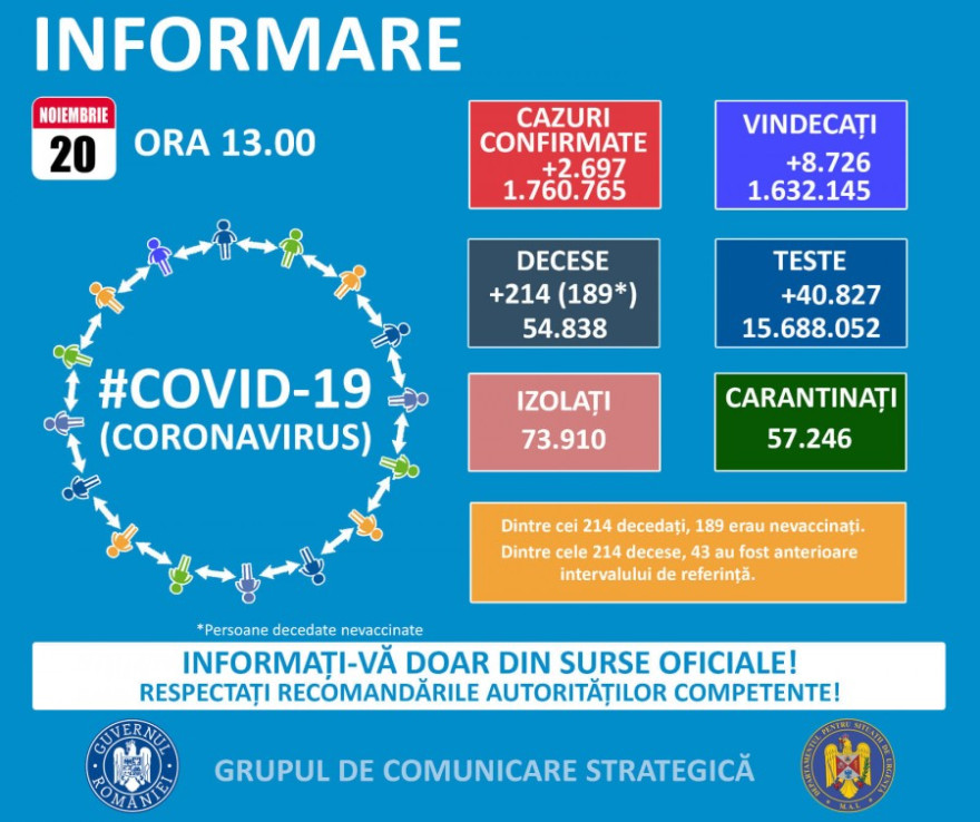Az elmúlt 24 órában 214 koronavírussal diagnosztizált személy haláláról érkezett jelentés; ebből 43 haláleset korábban következett be – közölte szombaton a Stratégiai Kommunikációs Csoport (GCS).
