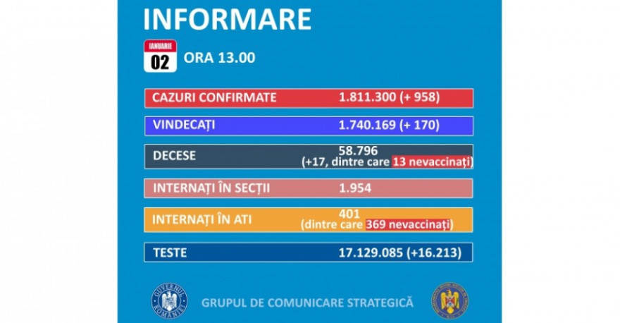 A legutóbbi tájékoztatás óta 958 új koronavírusos megbetegedést igazoltak Romániában, több mint 16.100 teszt eredményének feldolgozása nyomán – közölte vasárnap a Stratégiai Kommunikációs Csoport (GCS).