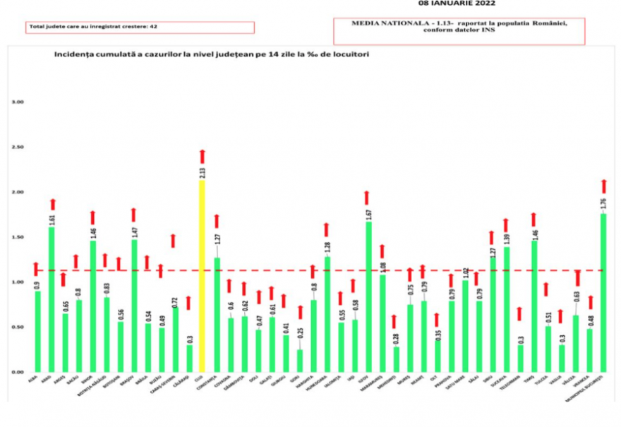 A fővárosban 1,76 ezrelékes a fertőzöttségi ráta, ismét nőtt az előző naphoz képest. Kolozs megyében 2,13, Ilfov megyében 1,67, Arad megyében 1,61 ezreléket regisztráltak.