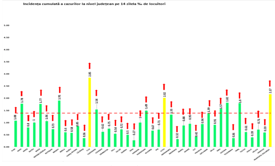 A fővárosban 2,17 ezrelékes a fertőzöttségi ráta, ismét nőtt az előző naphoz képest. Kolozs megyében 2,85, Ilfov megyében 2,02, Brassó megyében 1,91 ezreléket regisztráltak.