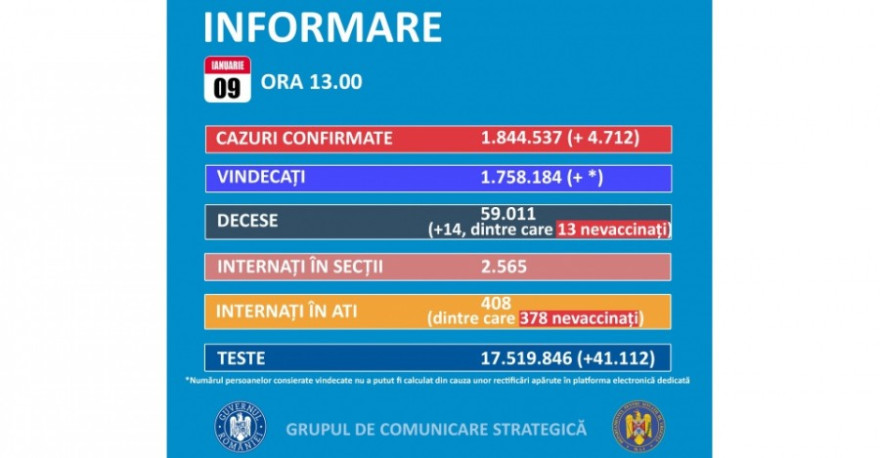 A legutóbbi tájékoztatás óta 4712 új koronavírusos megbetegedést igazoltak Romániában, több mint 41 ezer teszt eredményének feldolgozása nyomán; 391-en újrafertőződött betegek – közölte vasárnap a Stratégiai Kommunikációs Csoport (GCS).