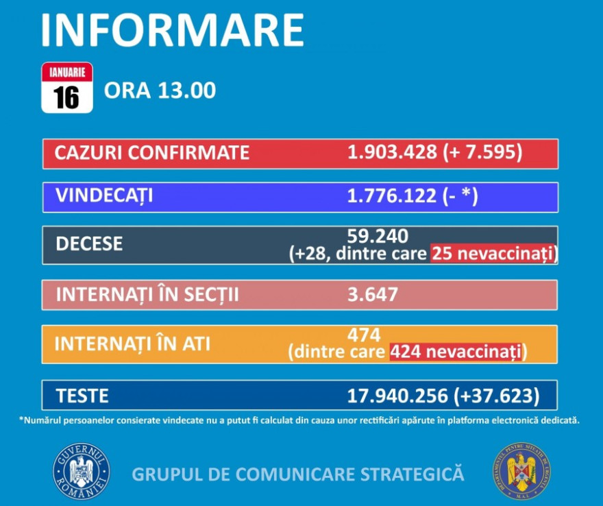 A legutóbbi tájékoztatás óta 7595 új koronavírusos megbetegedést igazoltak Romániában – 2467-tel kevesebbet, mint egy nappal korábban – közel 38 ezer teszt eredményének feldolgozása nyomán; 724-en újrafertőződött betegek – közölte vasárnap a Stratégiai Kommunikációs Csoport (GCS).