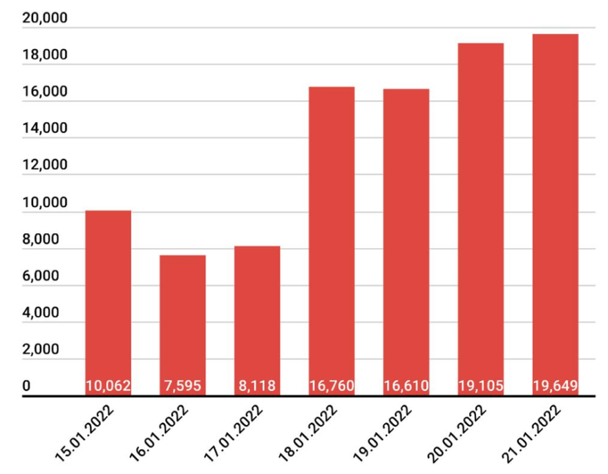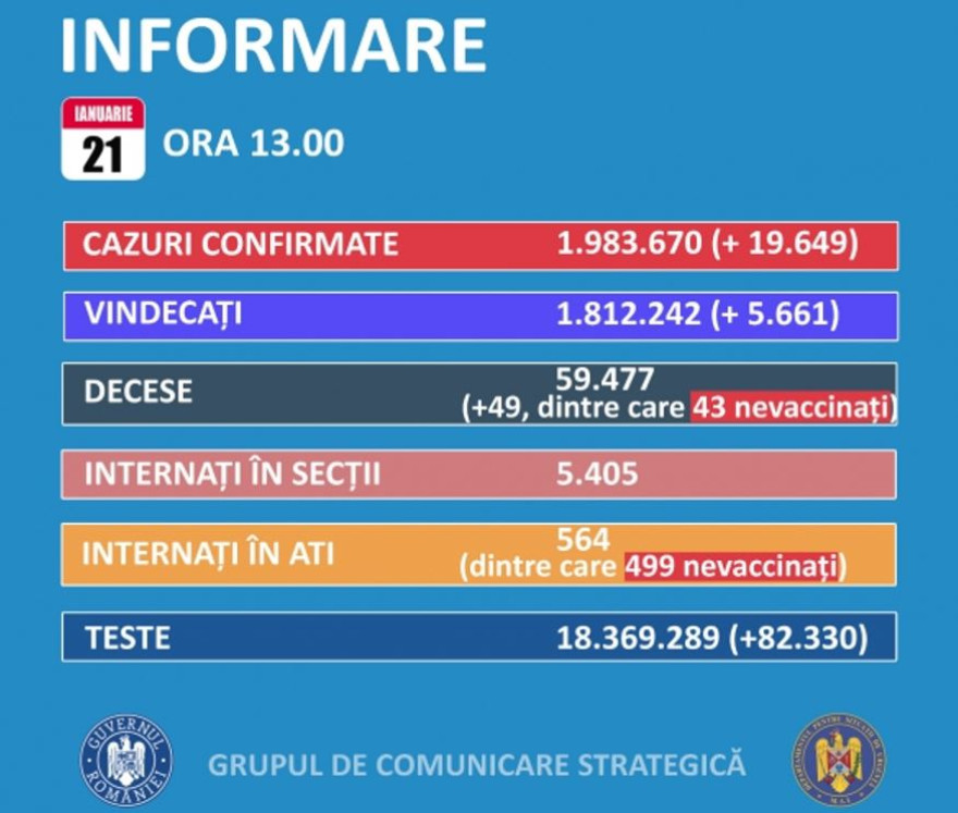 A legutóbbi tájékoztatás óta rekordszámú, 19.649 új koronavírusos megbetegedést igazoltak Romániában – 544-gyel többet az előző nap jegyzett esetszámnál -, több mint 82 ezer teszt eredményének feldolgozása nyomán; 2430-an újrafertőződött betegek – közölte pénteken a Stratégiai Kommunikációs Csoport (GCS).