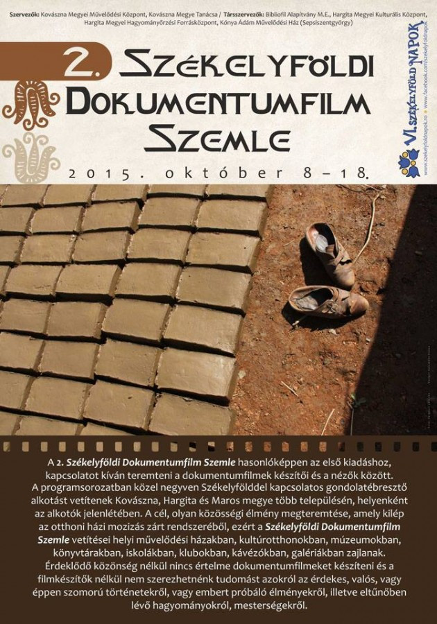 A VI. Székelyföld Napok részeként, október 8–18. között második alakommal szervezzük meg Kovászna és Hargita megyei kulturális intézmények összefogásával a Székelyföldi Dokumentumfilm Szemlét.