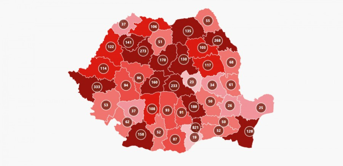 Az esetszám meghaladta a hétezret Bákó megyében (7184), hatezer fölött van Kolozs (6926), Temes (6882) és Argeş (6337) megyében, ötezer fölött van Galac (5712), Dâmboviţa (5637), Neamţ (5280), Bihar (5146), Ilfov (5146) és Dolj (5071) megyében. Az igazolt fertőzések száma több mint négyezer Konstanca, Vaslui, Arad, Vâlcea és Szeben megyében, és átlépte a háromezres küszöböt Fehér, Buzău, Brăila, Hunyad, Máramaros, Maros, valamint Vrancea megyében.
