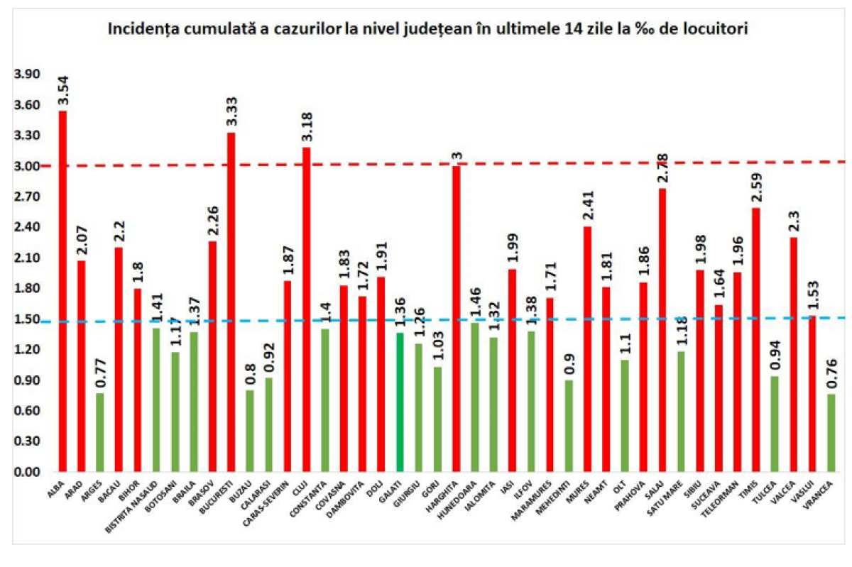 Az új megbetegedések összesített száma meghaladja a 2-es küszöbértéket Szilágy (2,78), Temes (2,59), Maros (2,41), Vâlcea (2,3), Brassó (2,26), Bákó (2,2) és Arad (2,07) megyében.