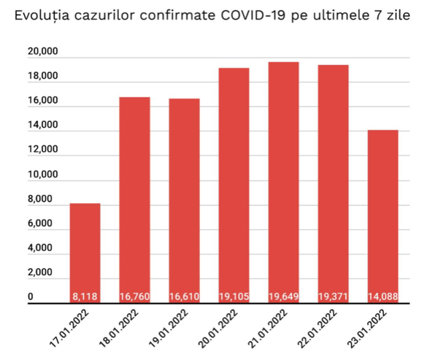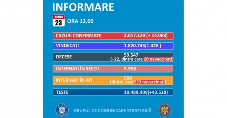 A legutóbbi tájékoztatás óta 14.088 új koronavírusos megbetegedést igazoltak Romániában – 5283-mal kevesebbet az előző nap jegyzett esetszámnál -, több mint 43 ezer teszt eredményének feldolgozása nyomán; 1400-an újrafertőződött betegek – közölte vasárnap a Stratégiai Kommunikációs Csoport (GCS).