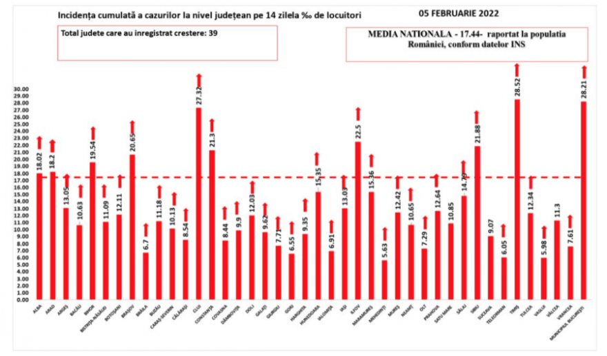 A városok közül a legmagasabb fertőzöttségi rátát – 40,39 ezrelék – az Ilfov megyei Otopeni-ben jegyzik, de magas az incidencia a Kolozs megyei Désen (35,65), Temesváron (36,68), Kolozsváron (35,14), Nagyszebenben (33,58), a Kolozs megyei Szamosújváron (33,97) és a Brassó megyei Vidombákon (33,18) is.