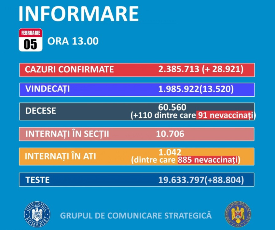 A legutóbbi tájékoztatás óta 28.921 új koronavírusos megbetegedést igazoltak Romániában – 2855-tel kevesebbet, mint egy nappal korábban -, mintegy 89 ezer teszt eredményének feldolgozása nyomán; 2922-en újrafertőződött betegek – közölte szombaton a Stratégiai Kommunikációs Csoport (GCS).