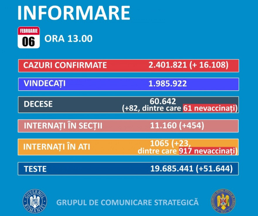 A legutóbbi tájékoztatás óta 16.108 új koronavírusos megbetegedést igazoltak Romániában – 12.813-mal kevesebbet, mint egy nappal korábban -, mintegy 51.600 teszt eredményének feldolgozása nyomán; 1.511-en újrafertőződött betegek – közölte vasárnap a Stratégiai Kommunikációs Csoport (GCS).