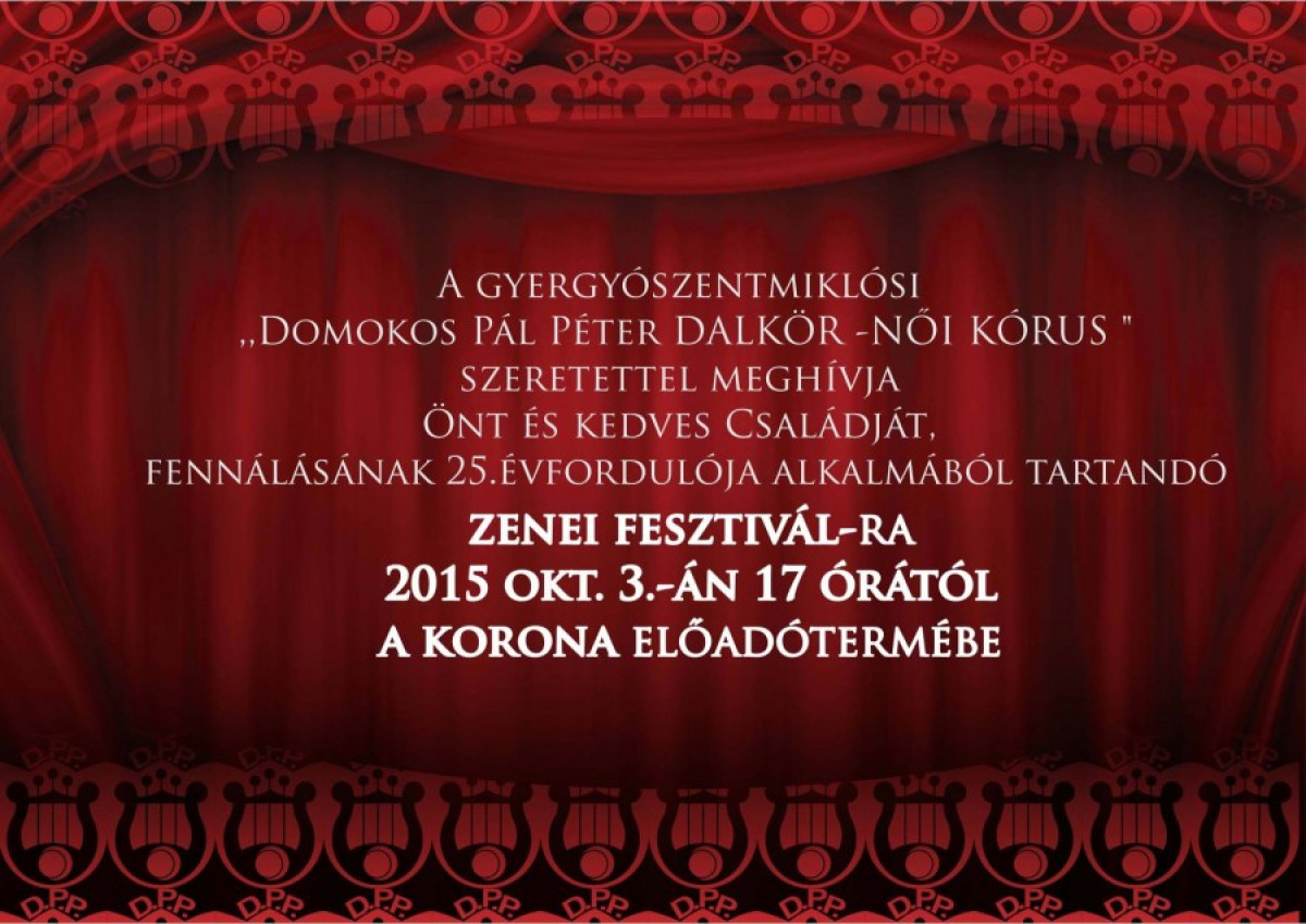 2015. október 3-án a KORONA előadótermében ZENEI FESZTIVÁLLAL ünnepli 25 éves évfordulóját a Domokos Pál Péter Dalkör – Női Kórus.