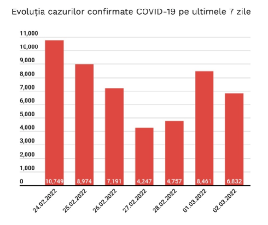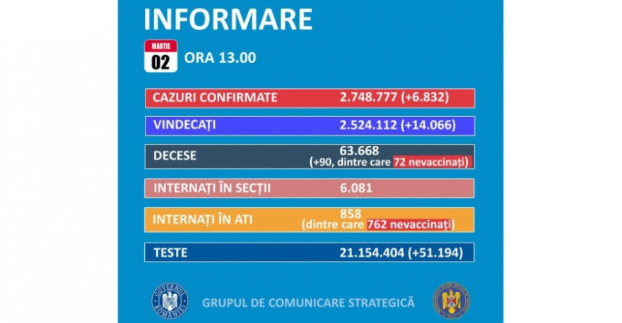 A legutóbbi tájékoztatás óta 6832 új koronavírusos megbetegedést igazoltak Romániában – 1629-cel kevesebbet, mint egy nappal korábban -, több mint 51 ezer teszt eredményének feldolgozása nyomán; 843-an újrafertőződött betegek – közölte szerdán a Stratégiai Kommunikációs Csoport (GCS).