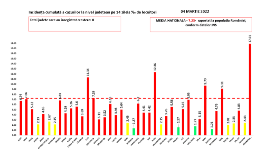 Négy megye zöld zónás: Hargita, Neamţ, Szatmár és Suceava. Nyolc megye sárga zónás.