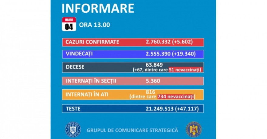 A legutóbbi tájékoztatás óta 5602 új koronavírusos megbetegedést igazoltak Romániában, több mint 47 ezer teszt eredményének feldolgozása nyomán; 701-en újrafertőződött betegek – közölte pénteken a Stratégiai Kommunikációs Csoport (GCS).