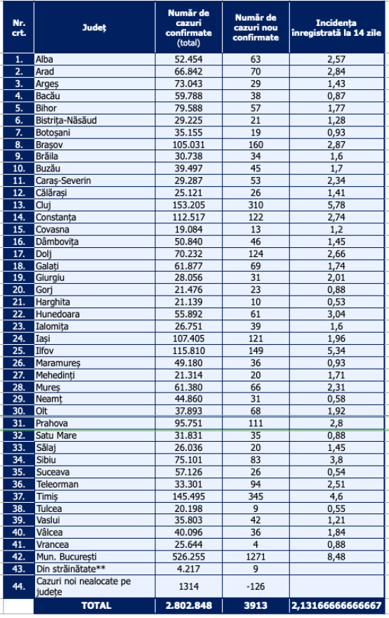 A legkevesebb új megfertőződést Vrancea, Tulcea, Hargita és Kovászna megyében regisztrálták.