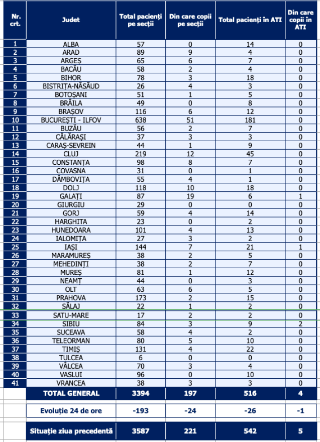 3394 személyt kezelnek kórházban Covid-19-cel, 193-mal kevesebbet, mint előző nap – jelentette szerdán az egészségügyi minisztérium.