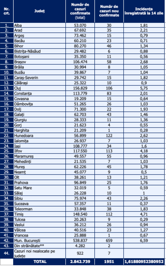 A legkevesebb új megfertőződést Vrancea, Hargita, Gorj és Szatmár megyében regisztrálták.