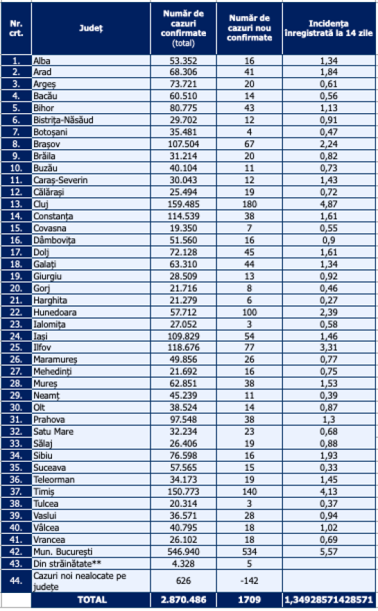 A legkevesebb új megfertőződést Ialomiţa, Tulcea, Botoşani, Hargita, Kovászna és Gorj megyében regisztrálták.