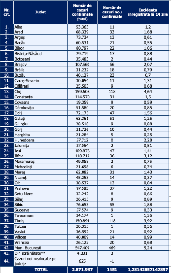 A legkevesebb új megfertőződést Teleorman, Tulcea, Botoşani, Máramaros, Ialomiţa megyében regisztrálták. Hunyad megyében egyetlen esetet sem jegyeztek.