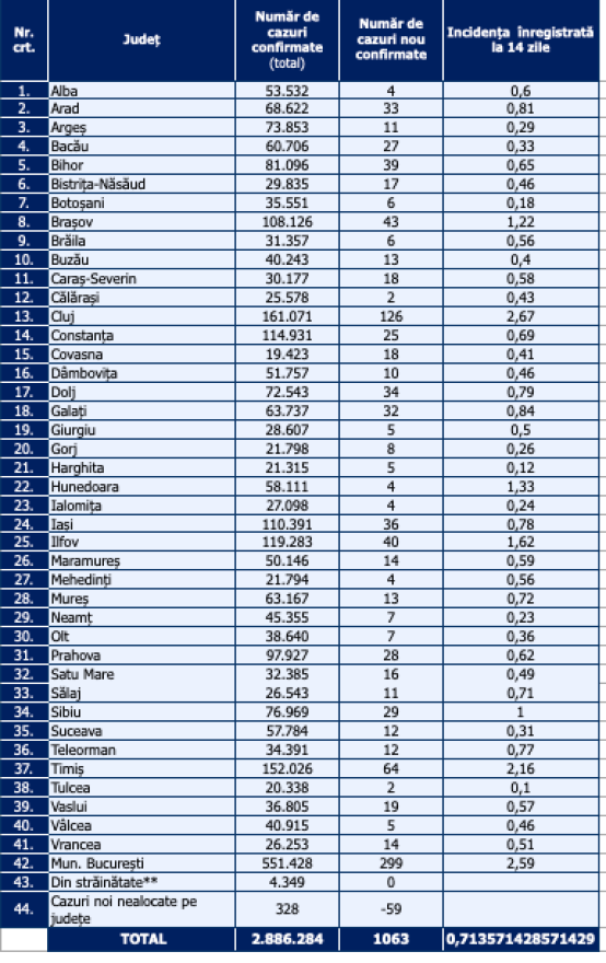 A legkevesebb új megfertőződést Călăraşi, Tulcea, Fehér, Hunyad, Ialomiţa és Mehedinţi megyében regisztrálták.