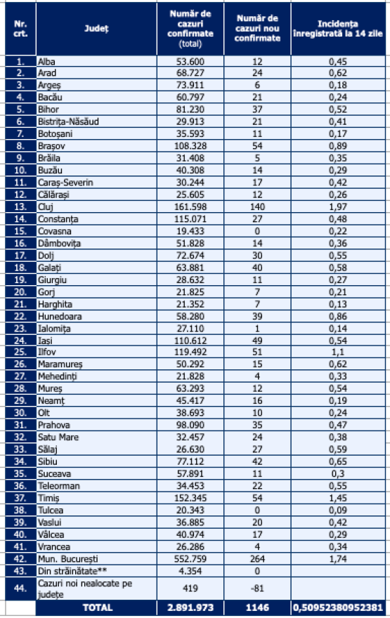 Kovászna és Tulcea megyéből egyetlen esetet sem jelentettek.