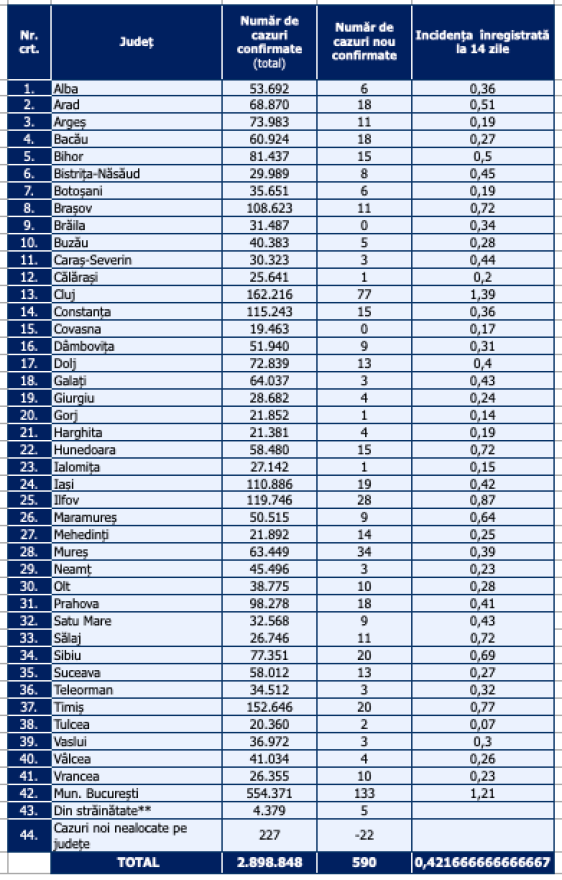 Brăila és Kovászna megyében egyetlen új esetet sem regisztráltak.