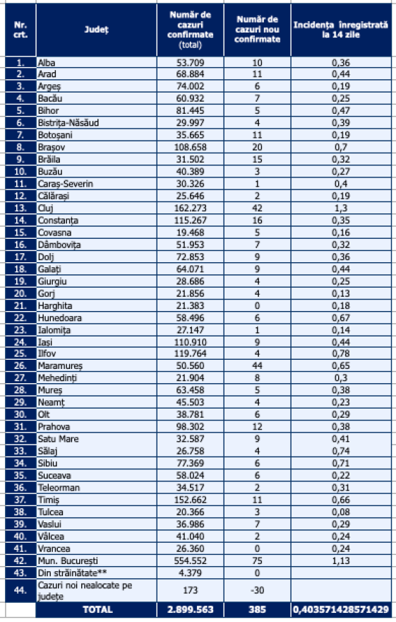 Az új esetekkel 2.899.563-ra nőtt a járvány eleje óta diagnosztizált fertőzöttek száma Romániában.