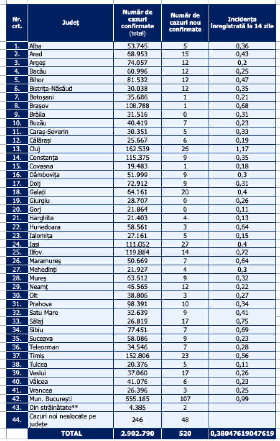 A legutóbbi tájékoztatás óta 520 új koronavírusos megbetegedést igazoltak Romániában – 68-cal kevesebbet, mint egy nappal korábban; 78-an újrafertőződött betegek – közölte szombaton az egészségügyi minisztérium.