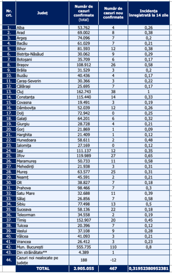 Az elmúlt 24 órában Bukarestből és Kolozs megyéből jelentették a legtöbb új koronavírusos megbetegedést – közölte csütörtökön az egészségügyi minisztérium.